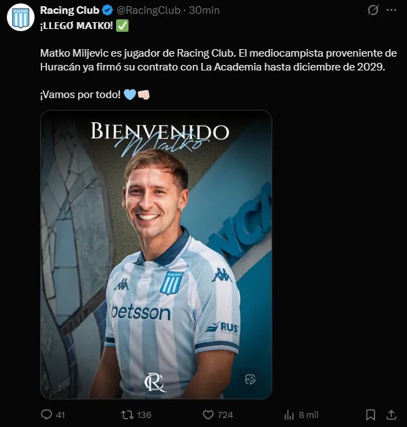 The transfer involved a series of intense negotiations between Racing Club and Huracán. Ultimately, Racing agreed to acquire 80% of Miljevic’s rights for $3 million. The agreed-upon payment structure will see the amount paid in 16 installments.